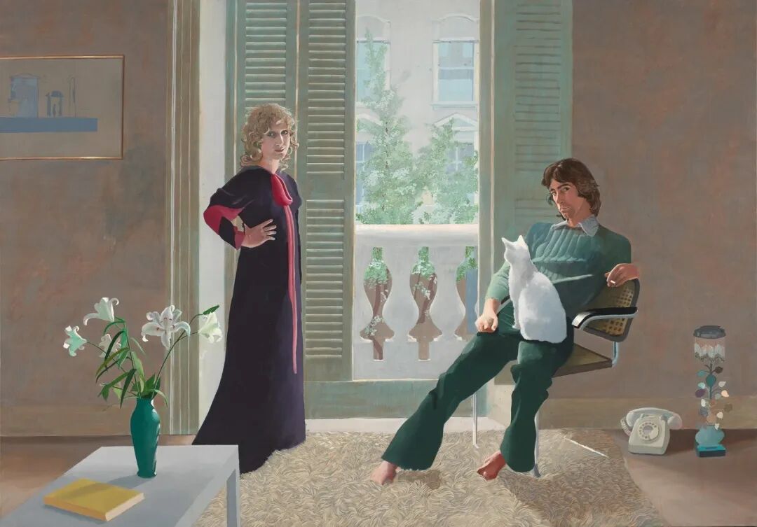 就像霍克尼对伦敦的许多描绘一样,这幅画的色彩相当柔和,人物是逆光的,他们身上的深色衣服和室内装饰、以及被照亮的白色猫咪相映成趣。他们身后的百叶窗开了一半,露出阳光明媚的阳台与下方街道上的树,展示了房间外部的一小片世界。