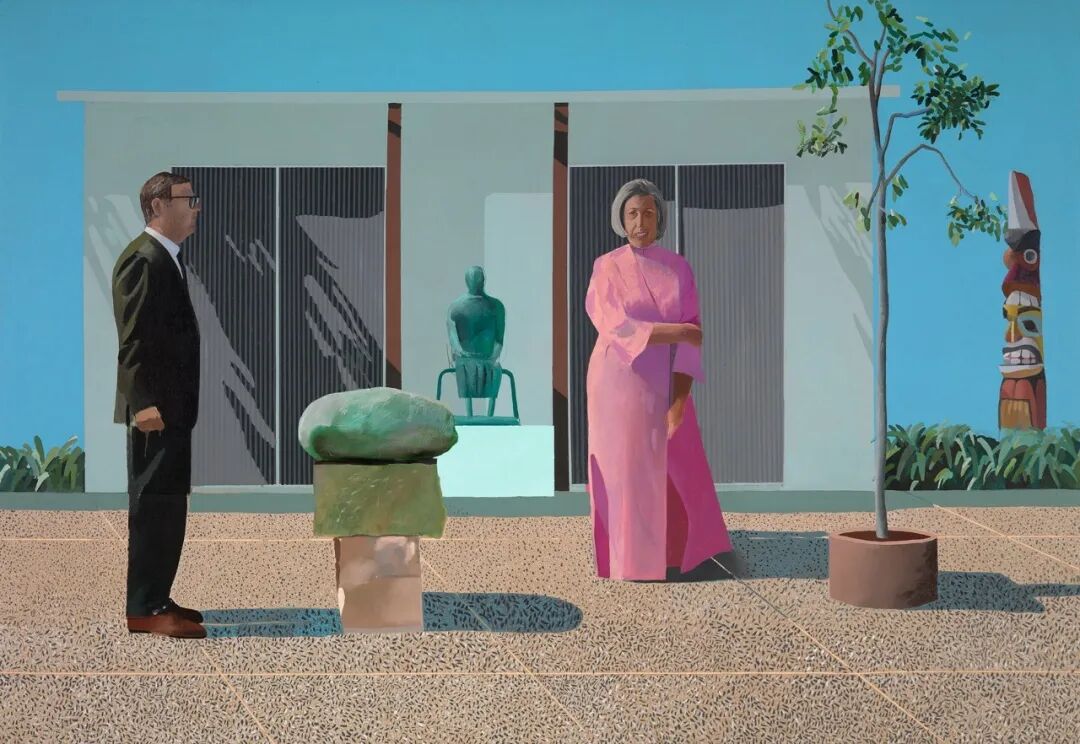 霍克尼在1960年代后期创作的肖像画,往往能够提供对当时美国的社会情绪和文化的洞察。《美国收藏家》就创作于这一时期。霍克尼在这幅画中描绘了他的朋友、收藏家弗雷德和玛西娅·韦斯曼夫妇。他们在1970年代中期结束了这段婚姻,但两个人依然保持着密切的关系。