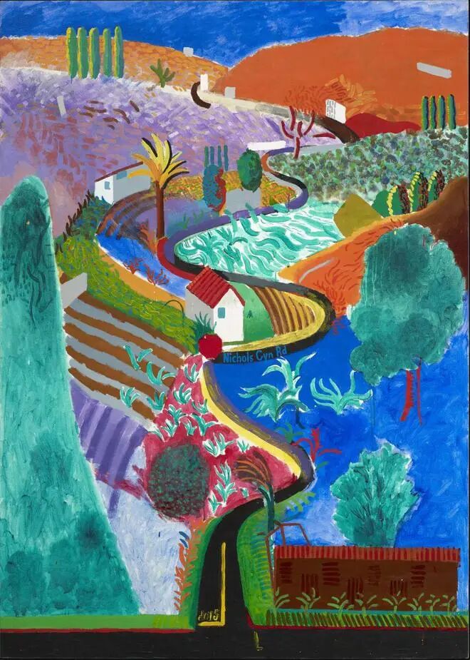 画面描绘了位于好莱坞山尼科尔斯峡谷顶部通往霍克尼家的蜿蜒道路:霍克尼的家出现在构图右侧,蓝色泳池沐浴在加州阳光下熠熠生辉。