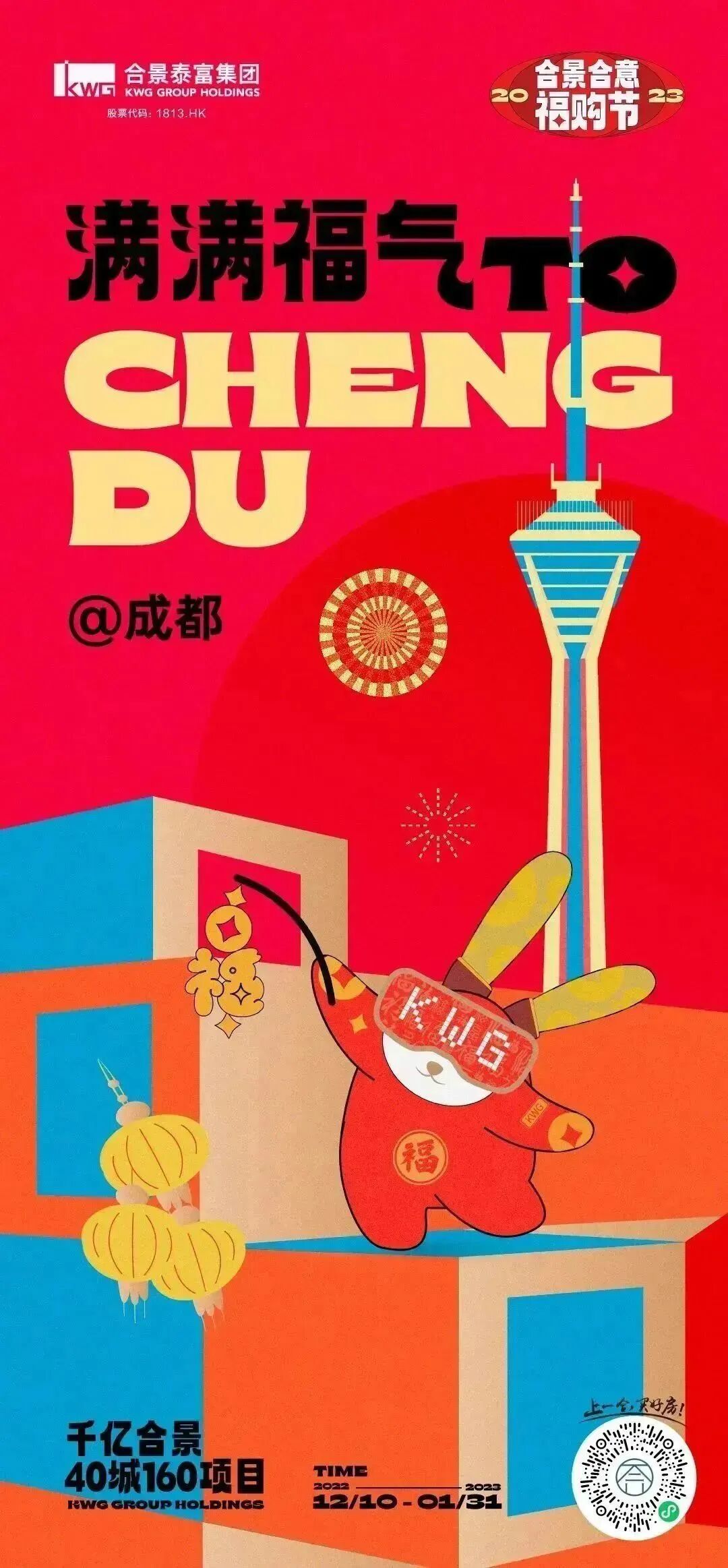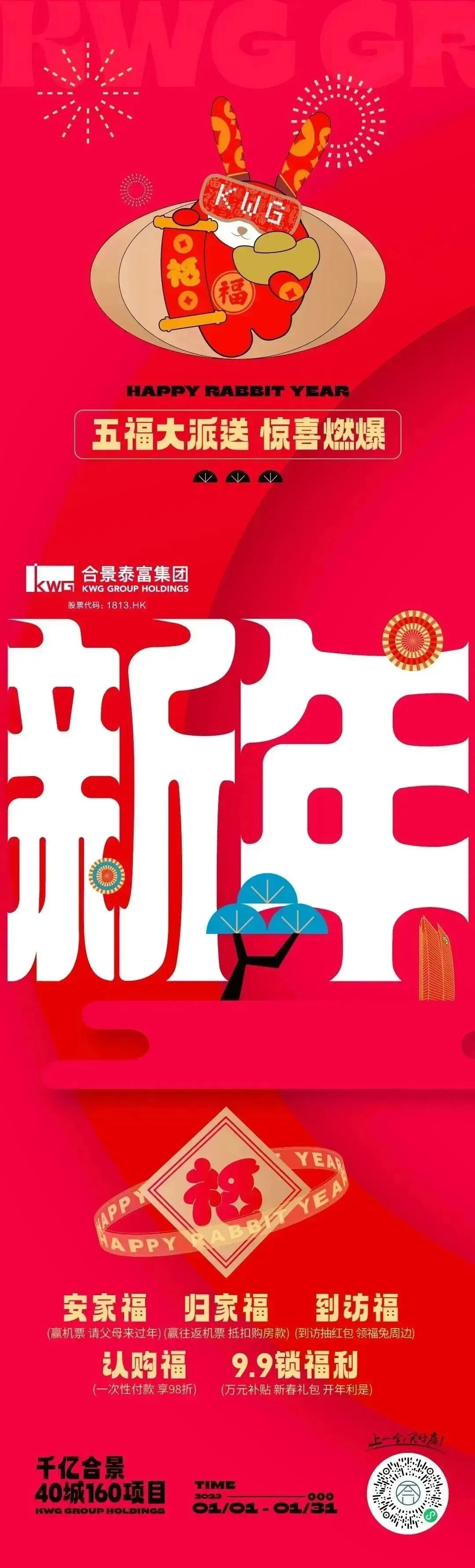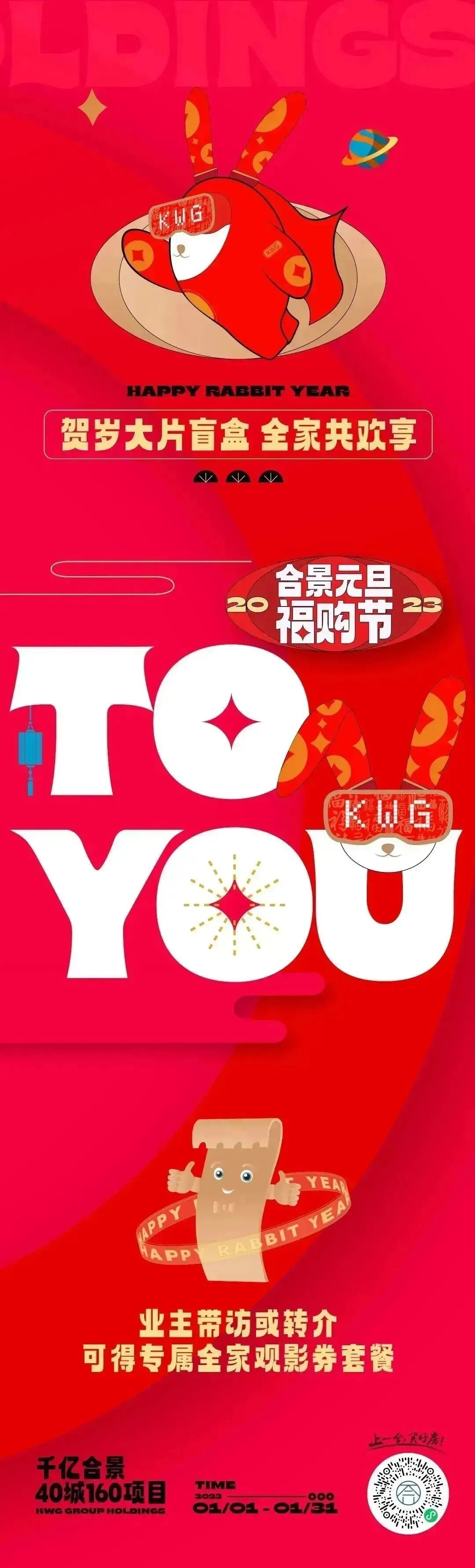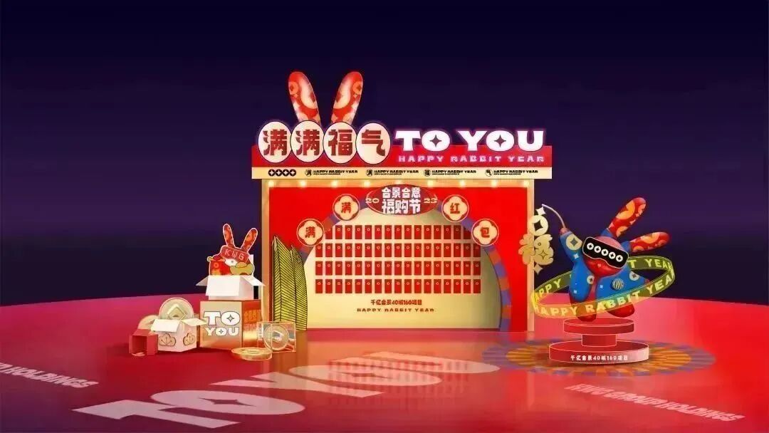 在2022年底至2023兔年前夕,我们为合景泰富打造了一场“满满福气TO YOU”的跨年福购节。为了让品牌传播更具识别度,更抓眼球,经过多次脑暴,决定打造一款发福兔IP,作为这次campaign的超级符号,让其具象化落地。同时契合兔年新春佳节,人们追求多福的心愿,让发福兔成为美好幸福代言兔。