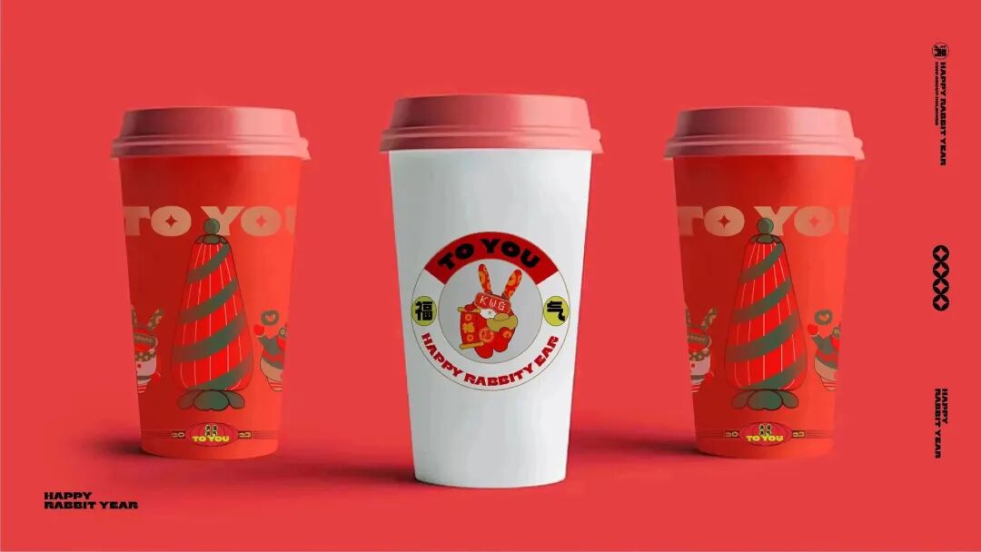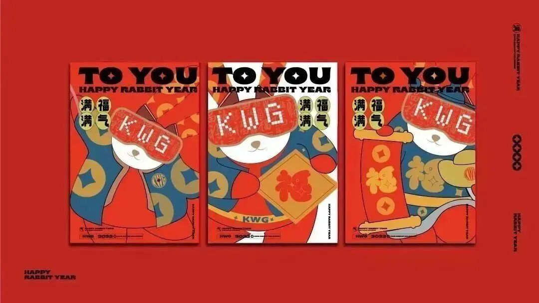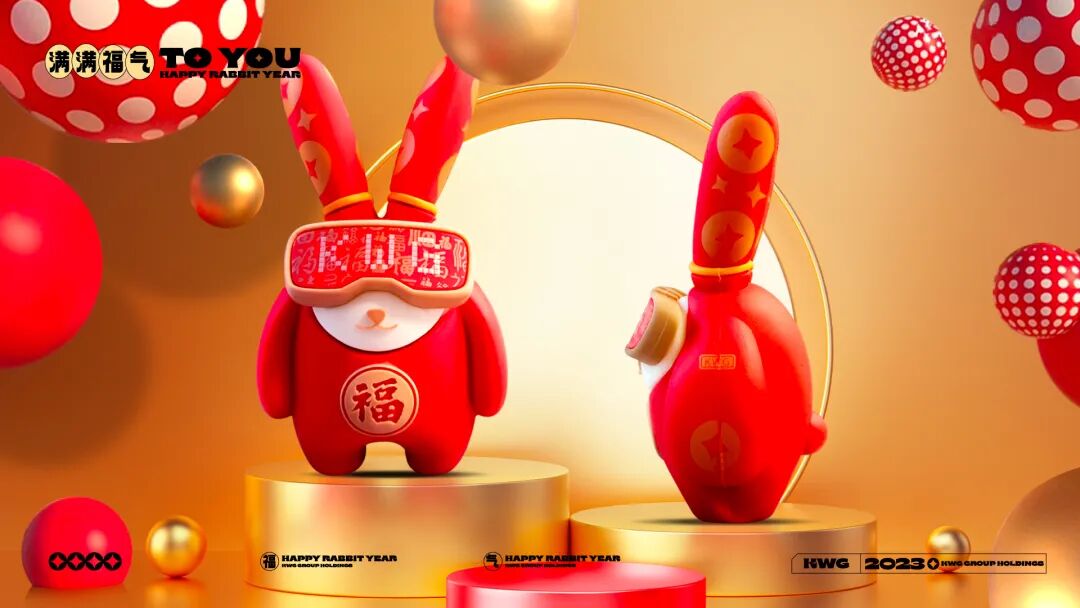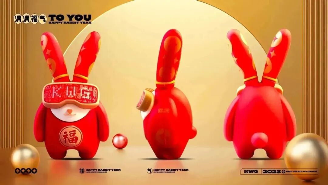 作为国人熟知的生肖兔,既要有传统文化传承,又要玩出新花样。经过多次探讨修改,确定了最终形象:一身大红醒目装,寓意生活红红火火。长耳朵印着钱币花纹,源源不断接收财运。胸前一个“福”字,送福到家。头戴VR眼睛,充满梦想和好奇心,极具未来感和时尚感,能量十足。