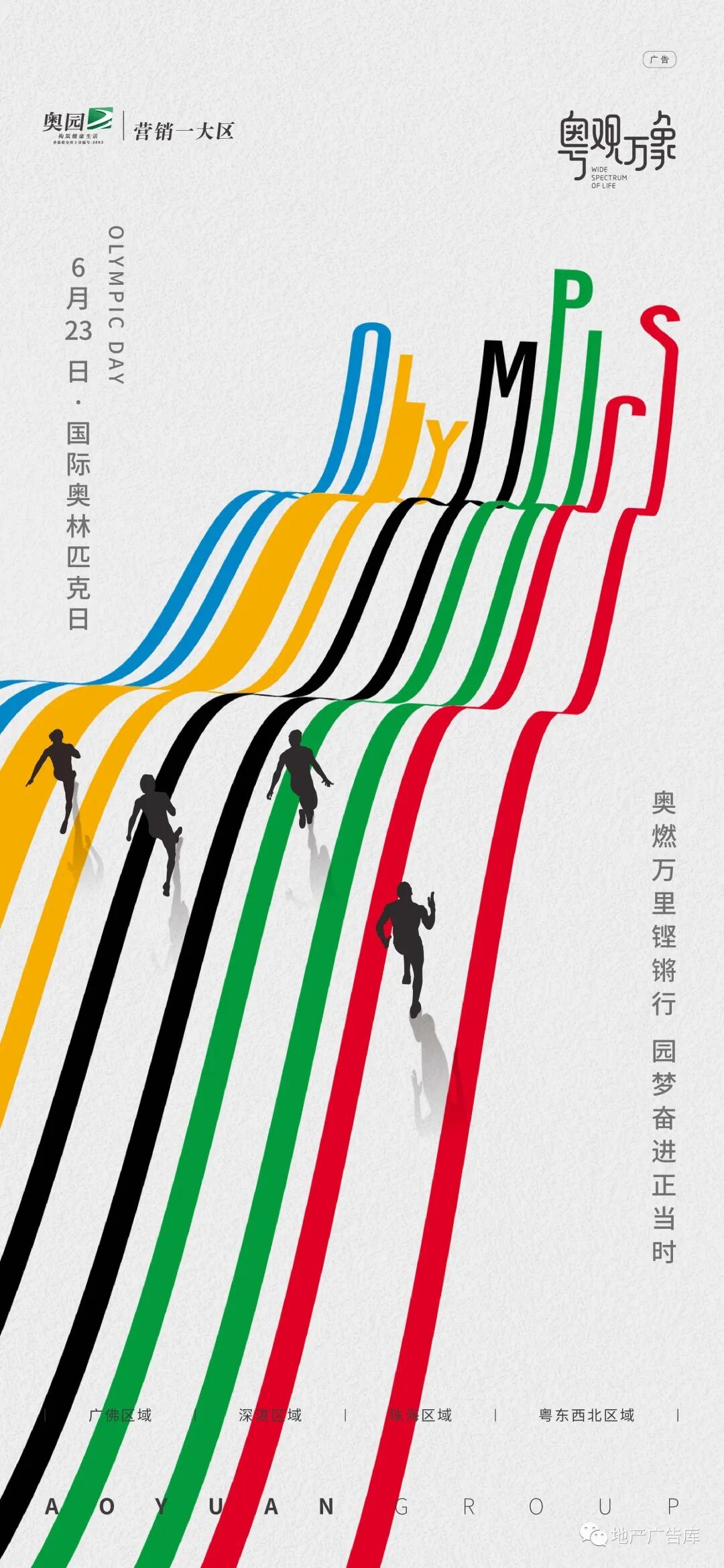 奥林匹克英文体现精神引领,于五色赛道上奔跑代表众人在时代浪潮中竞技,斜角构图更有张力。奥园与奥林匹克渊源深远,在勇气和力量的赛场上不断“园”梦奋进。