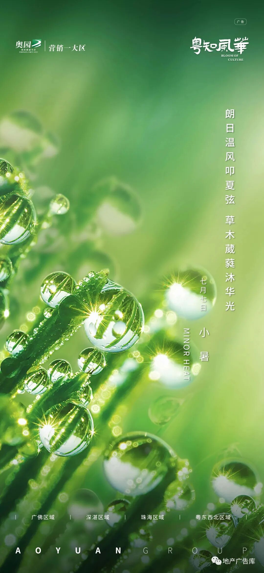 选用清晨露珠特写,露珠中倒映出无限绿意,表现小暑时节岁有骄阳,夏日清嘉。