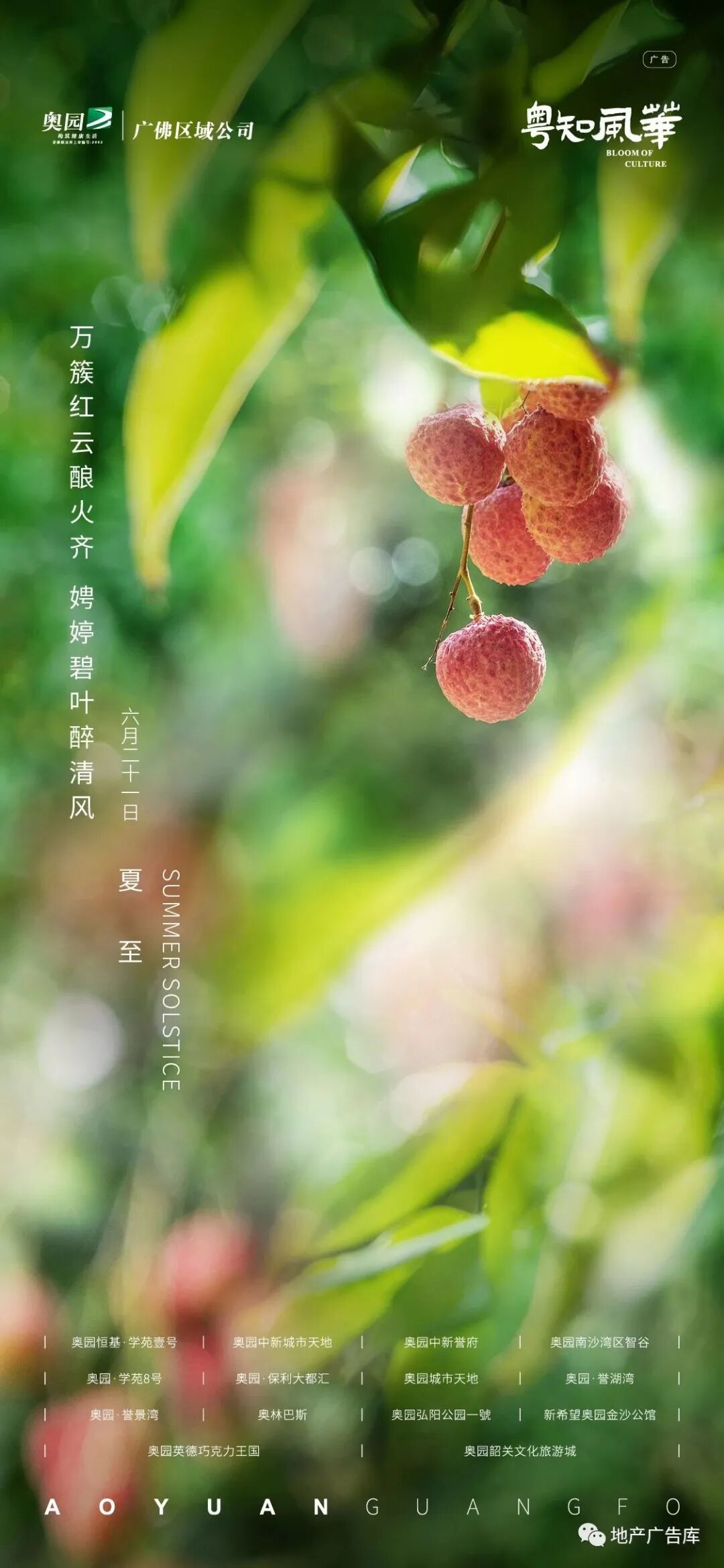 岭南夏至食荔枝为一大风俗。以荔枝为主视觉,引用《咏荔枝》中“万簇红云酿火齐”一句,在长夏里,荔林红若焰,绿意醉清风。