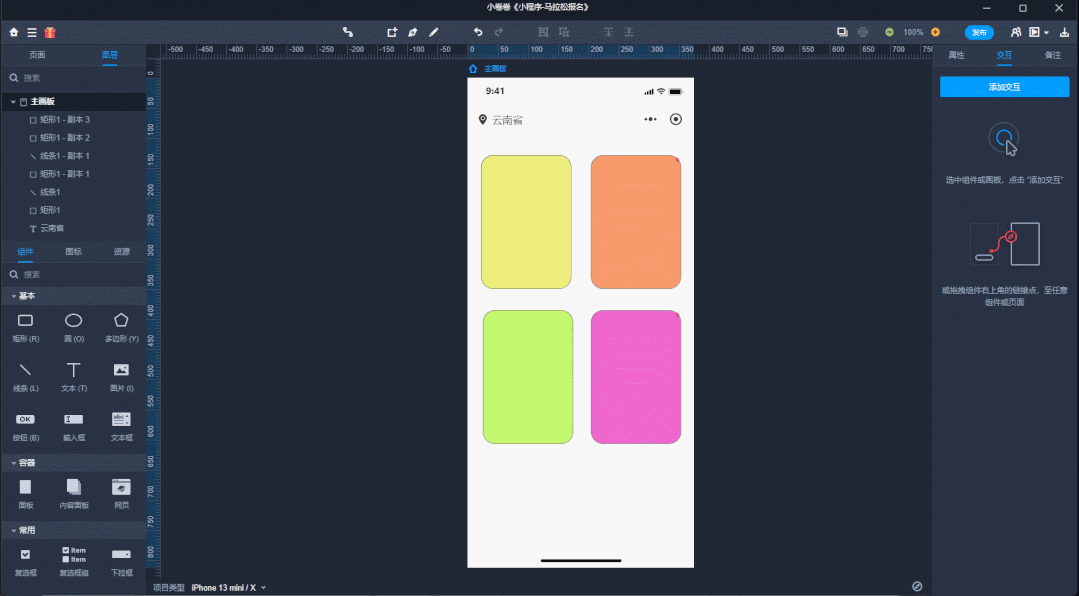 全面的交互类型,页面级、画板级、组件级、状态级交互拖拽即可设置,复杂交互轻松完成。