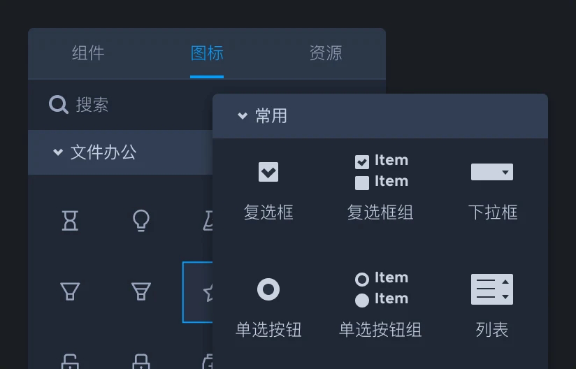内置丰富组件,以及上千图标,多种分类,粗细两种风格随需选用,组件自带交互属性,在线设计更便捷。