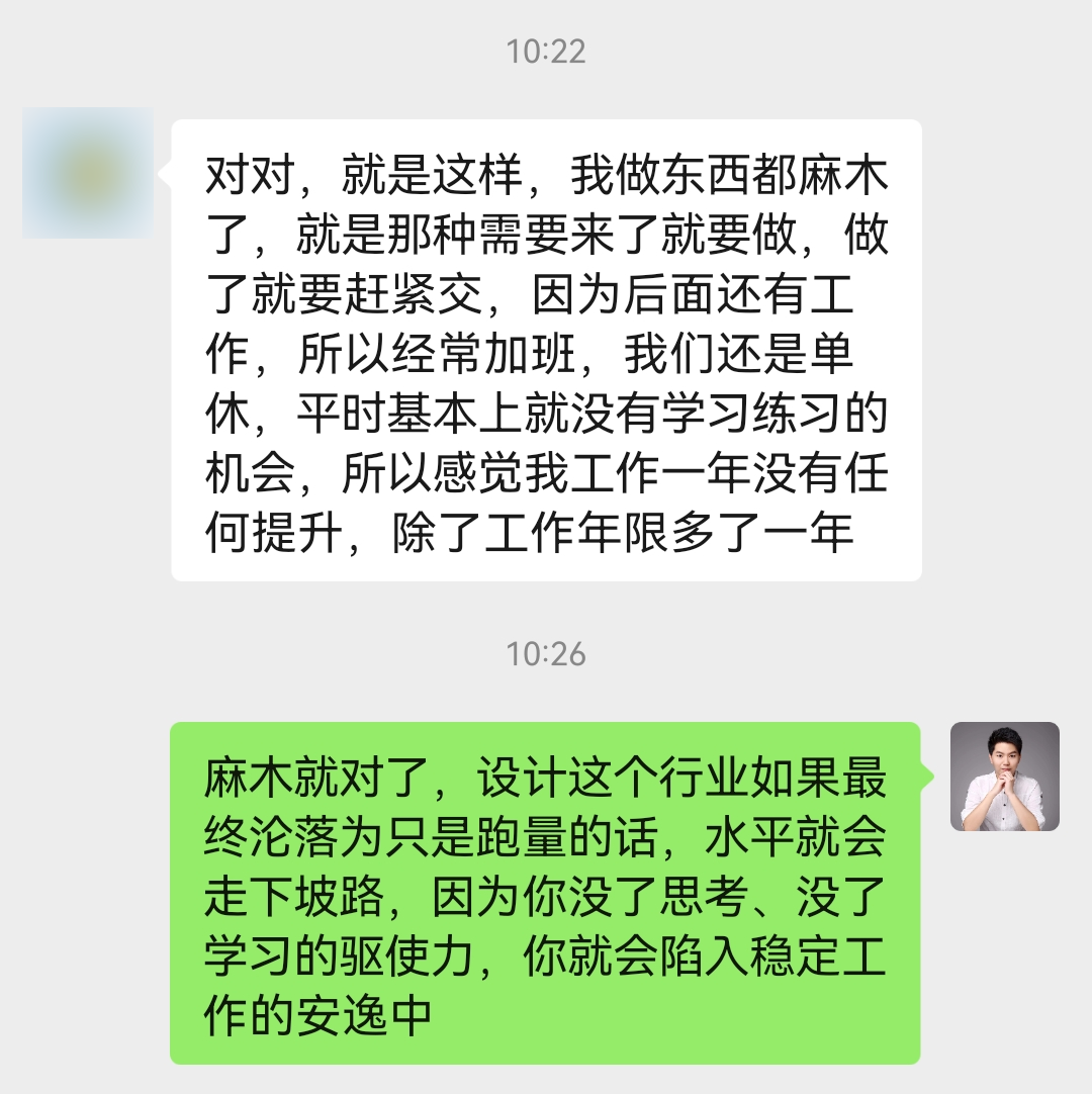 正如我前面所说的那样,当设计师的工作从质演变为只追求量,而你又安于现状时,那么必然会导致能力停滞不前甚至走下坡路。