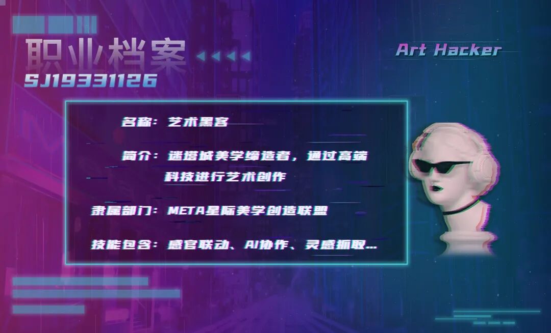 艺术黑客是迷塔城的美学缔造者,他们能熟练使用人工智能,通过包含但不限于全息影像技术等在内的高科技进行全方位艺术创作,隶属于Meta星际美学创造联盟。