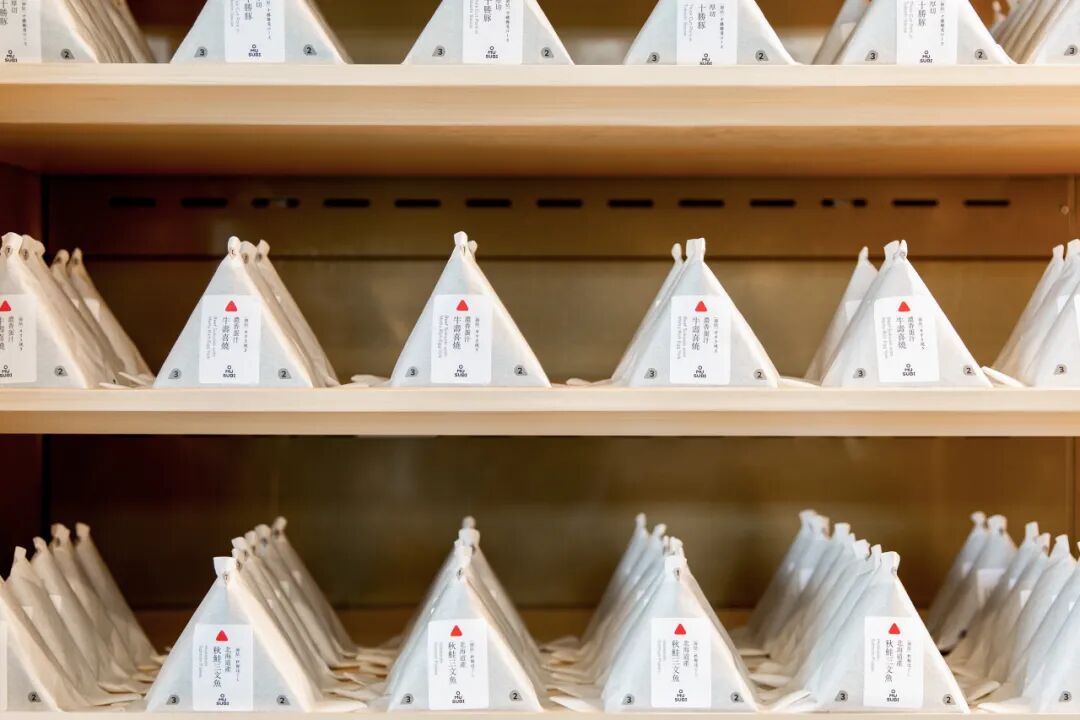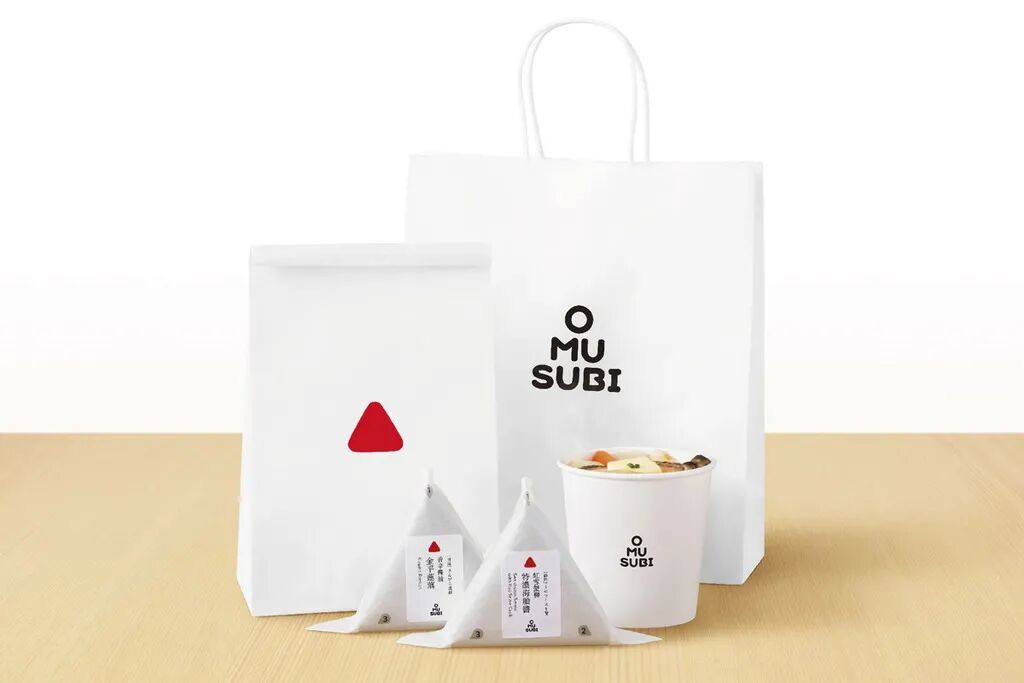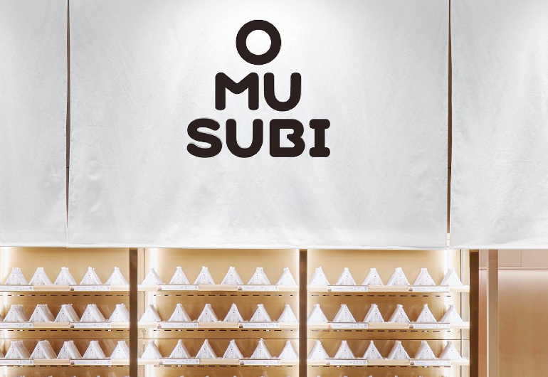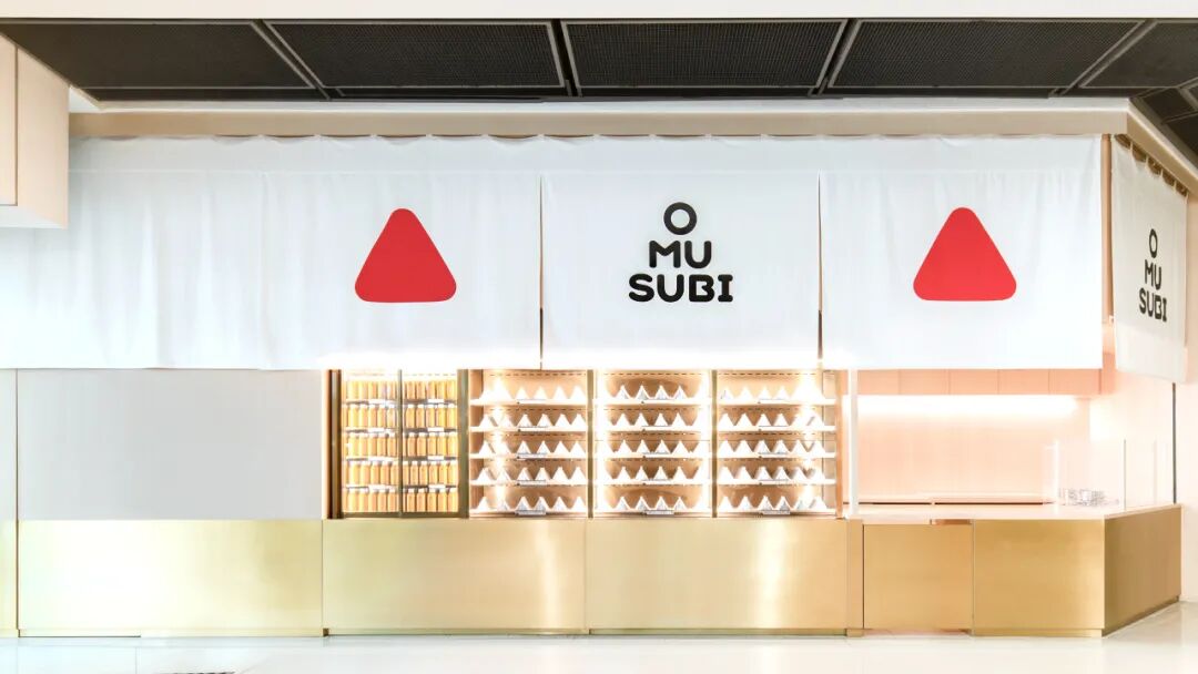 品牌标志设计是一个红色的圆角三角形,就像个饭团一样,文字也是三角形的上下堆砌“O MU SUBI”。这样的排序也挺有趣的,双重记忆点
