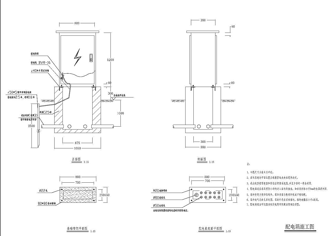 室外地面安装配电箱时,需选用防护等级不低于IP54,基础需高出地面不小于300mm,下图为配电箱施工图: