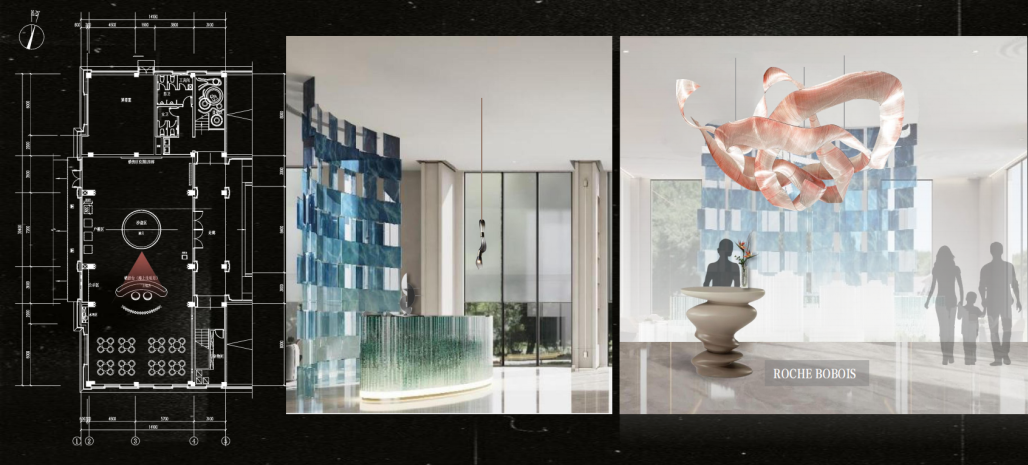 “新旧交替&中西合璧”——在现代化的空间中,使用中国传统的元素和色彩体现文化自信,将传统的元素进行解构,与现代化结合,在空间中体现传统与当代的碰撞与交流。