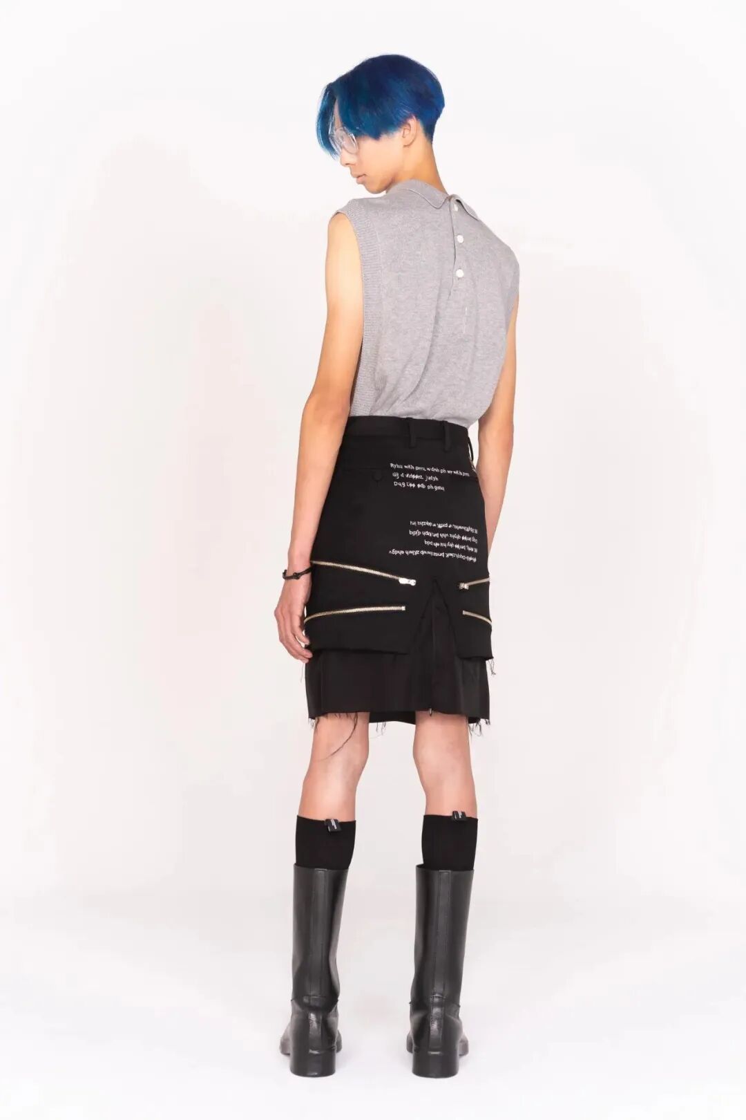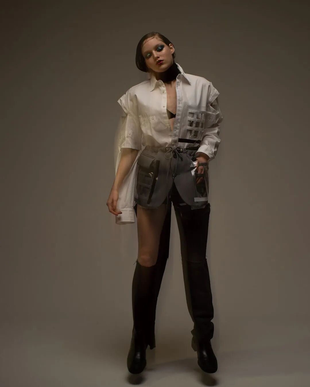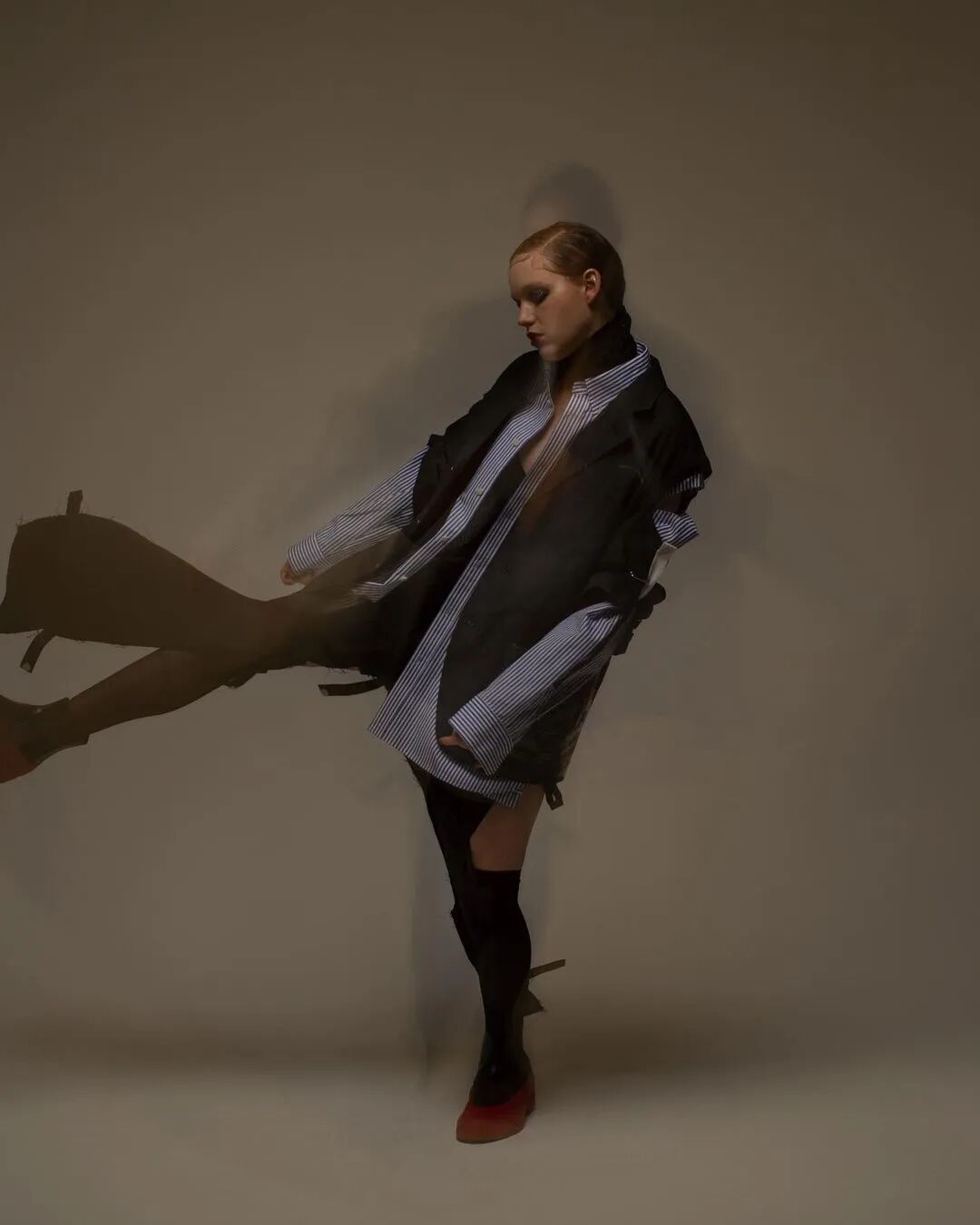 这个系列揭示了对箱包产品的质疑——这只是消费主义的产物。看到Runway上过于饱和的箱包产品,想象着模特不带包的状态,开始质疑携带包的必要性。几近亵渎地将其融入到衣服内,袋状但不是袋子的结构,超出口袋的定义。