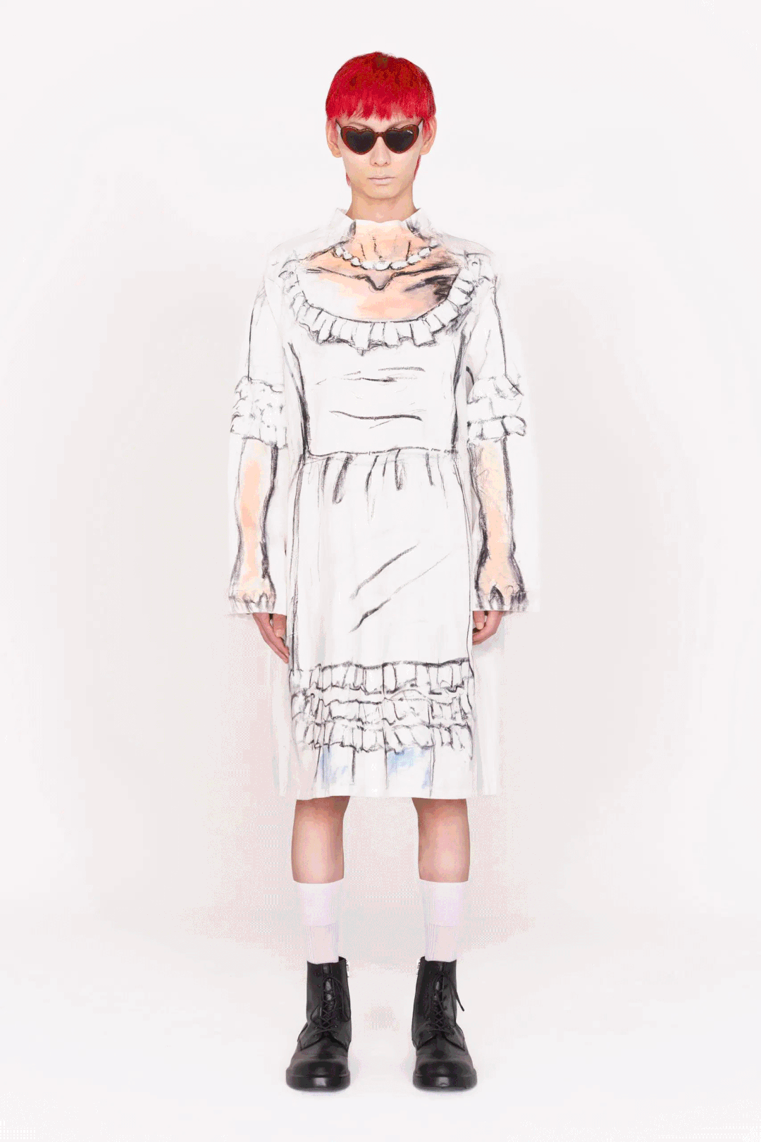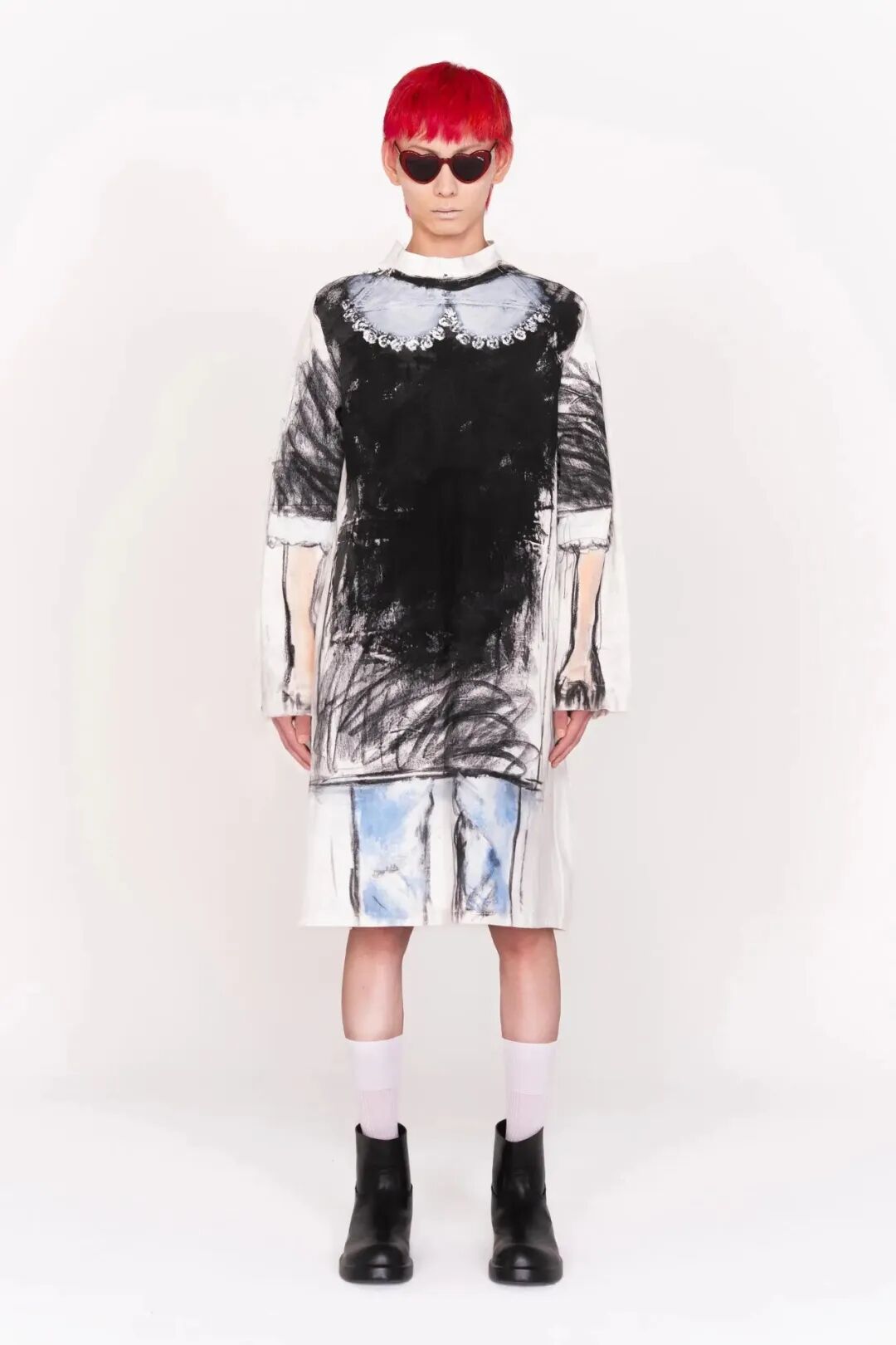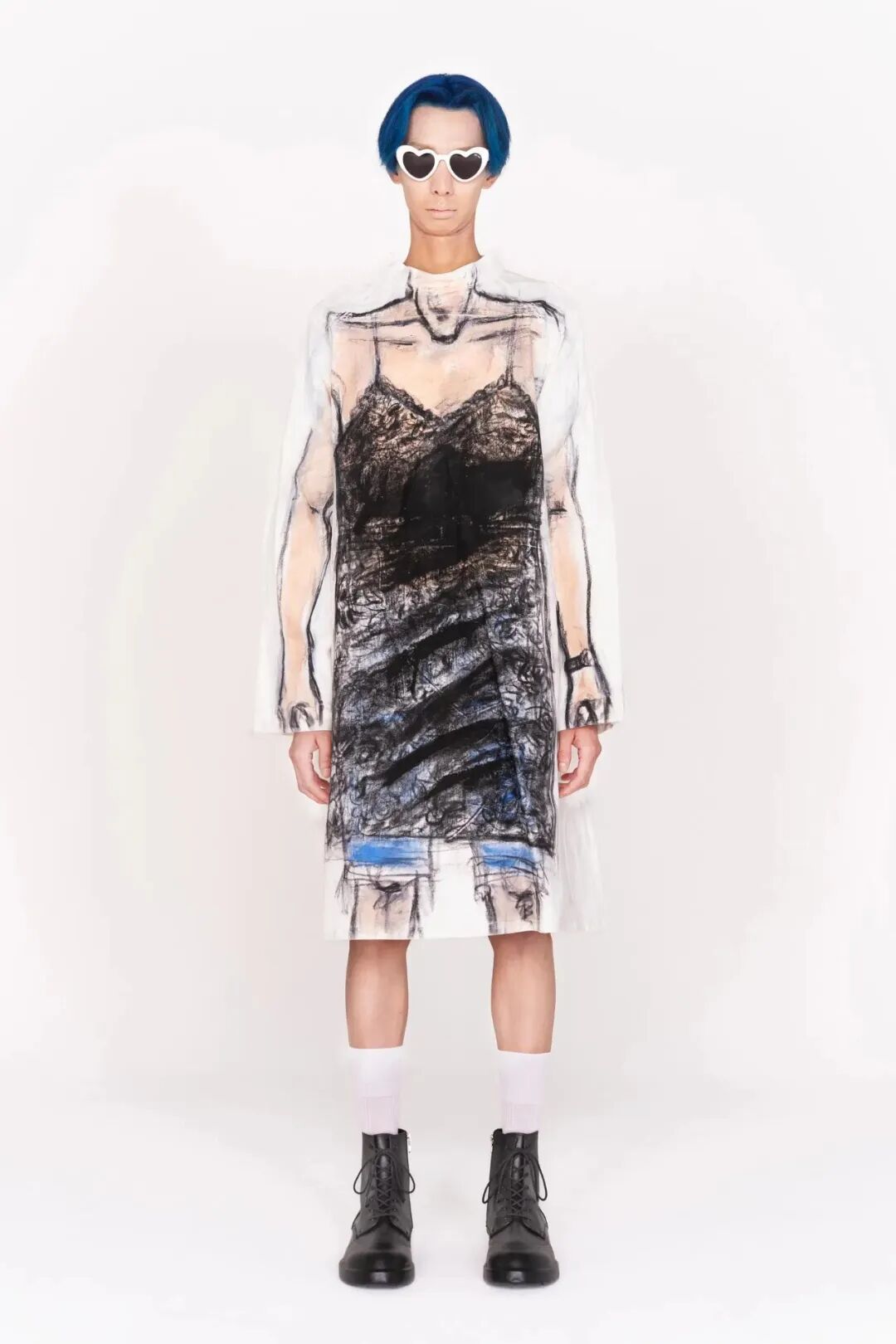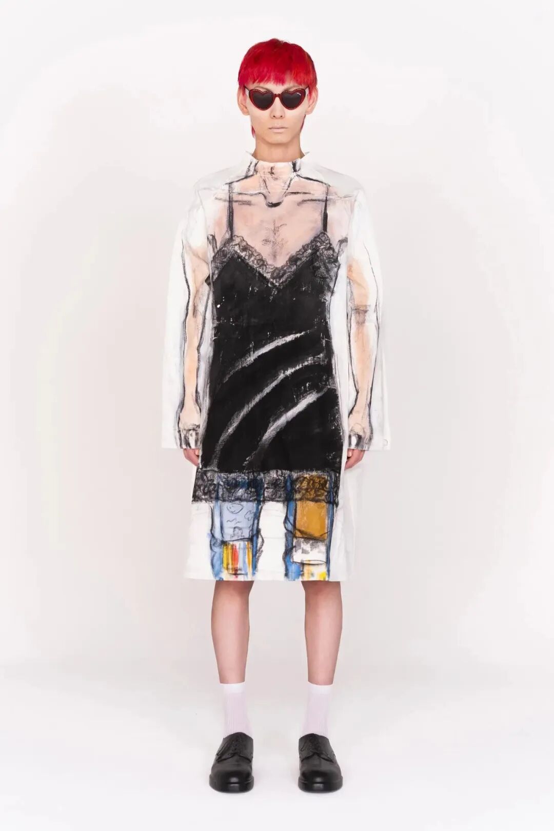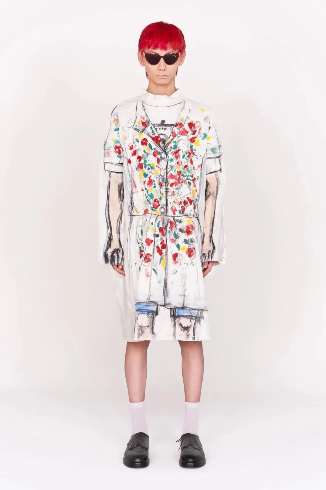 这个系列的第一部分,灵感来自一种向前颠簸和避免重复的创造性本能,设计师Takahiro Miyashita将摇滚歌手Kurt Cobain的部分演出造型手绘在医用长袍上,达到一种错视效果。