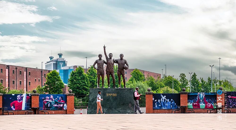 ▼ 老特拉福德球场前,纪念曼联首夺欧冠冠军40周年的三剑客雕像